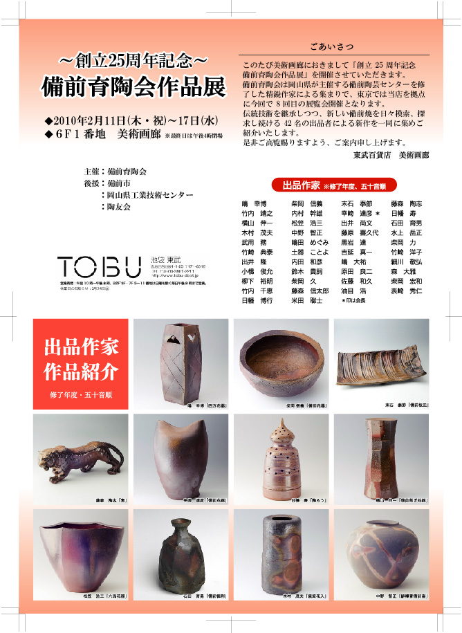 岡山県が主催する「備前陶芸センター」の研修を修了した備前焼の精鋭作家が一堂に集う「備前育陶会」。
