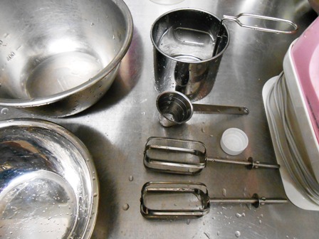 ボール2個 小麦粉ふるい1個 20ccのスプーン ハンドミキサー ペットボトルのキャップ ゴムヘラ