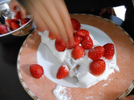 おぼうずらも手伝いたいとの強い希望があったのでイチゴをのせてもらうことに。