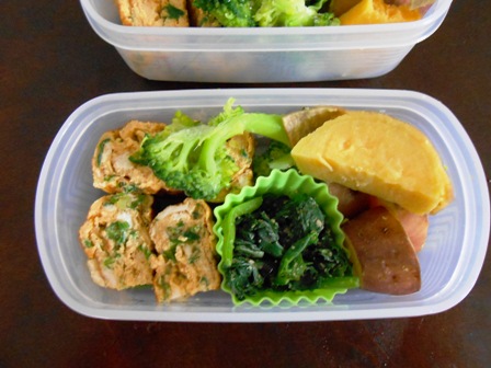 きんぴら、ほうれん草のふじっこあえ、ひき肉入り卵焼き、ねぎ入り卵焼き、さつまいものレモン煮、ブロッコリーのナムル、肉団子。