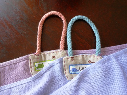うーん。別の布をつけて紐をつける。名前も。こまかいw
