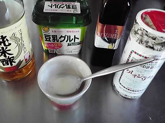 豆乳グルト、酢、クレイジーソルト、オリーブオイル。