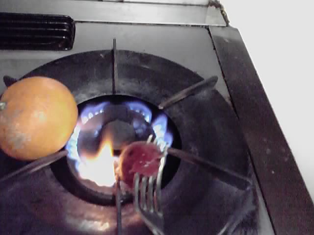 次に梅干を火であぶり黒焼きにします。表面が焦げたくらいでいいです。